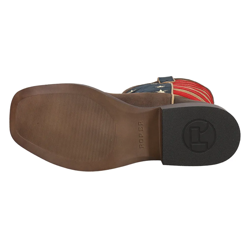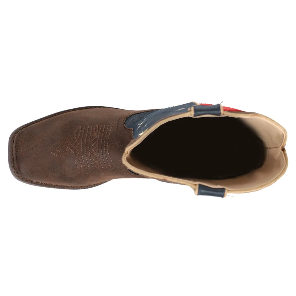 Show your patriotism in these fashionable western boots. Made with faux leather and features the American flag on the shaft. This western boot has a padded comfort insole and a rubber outsole for stability and traction. Live a life of freedom when you wear these boots from Roper.