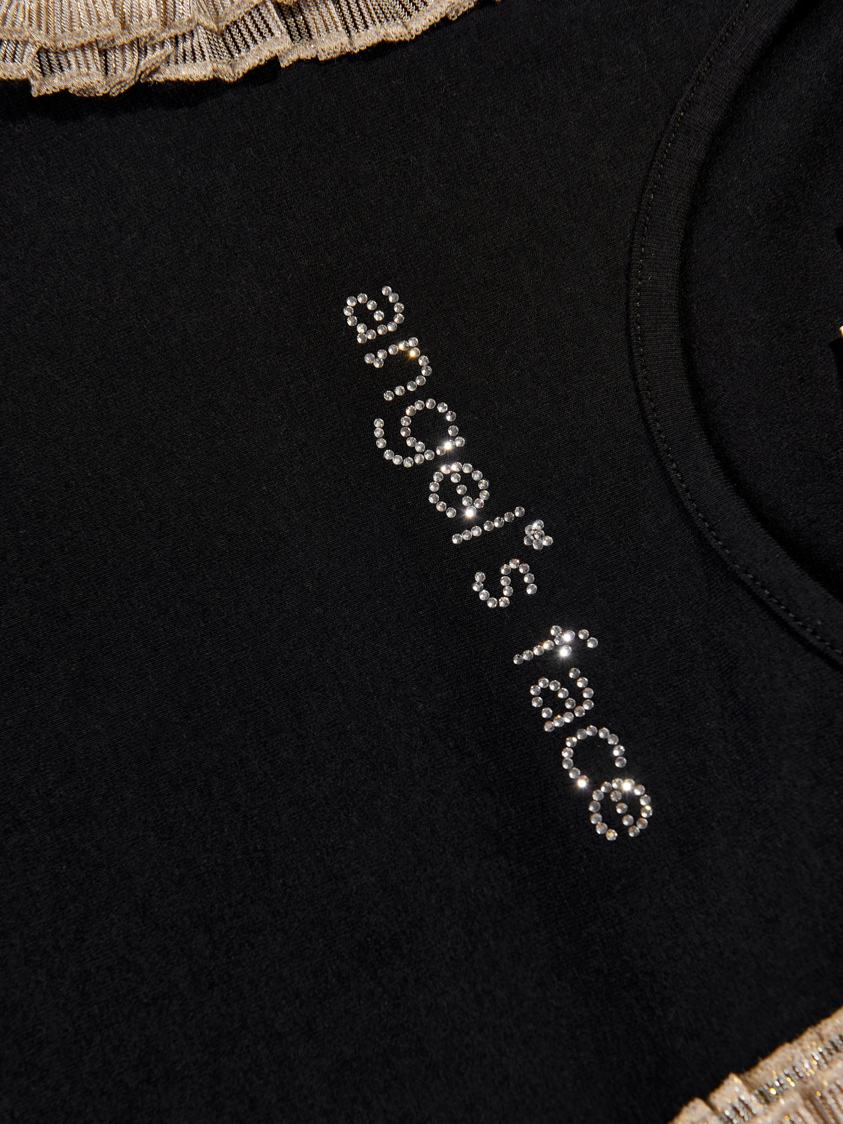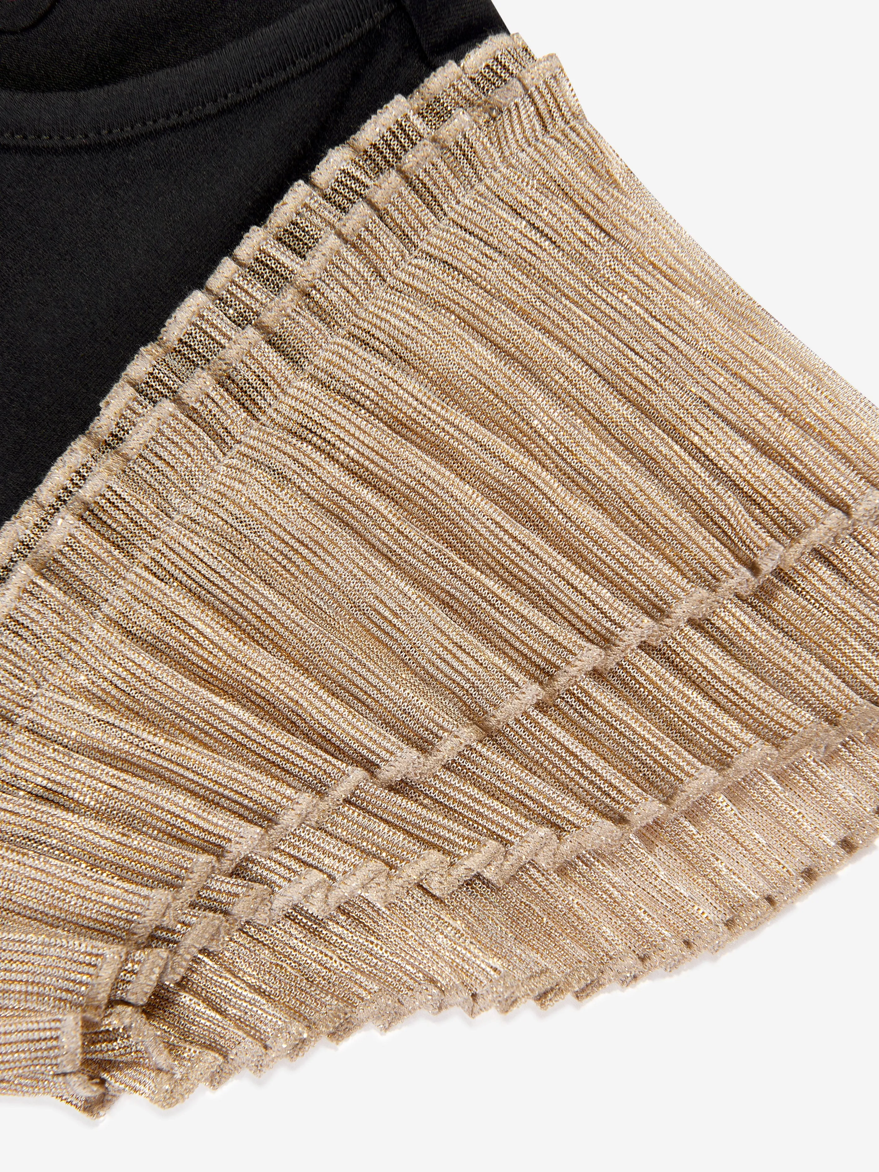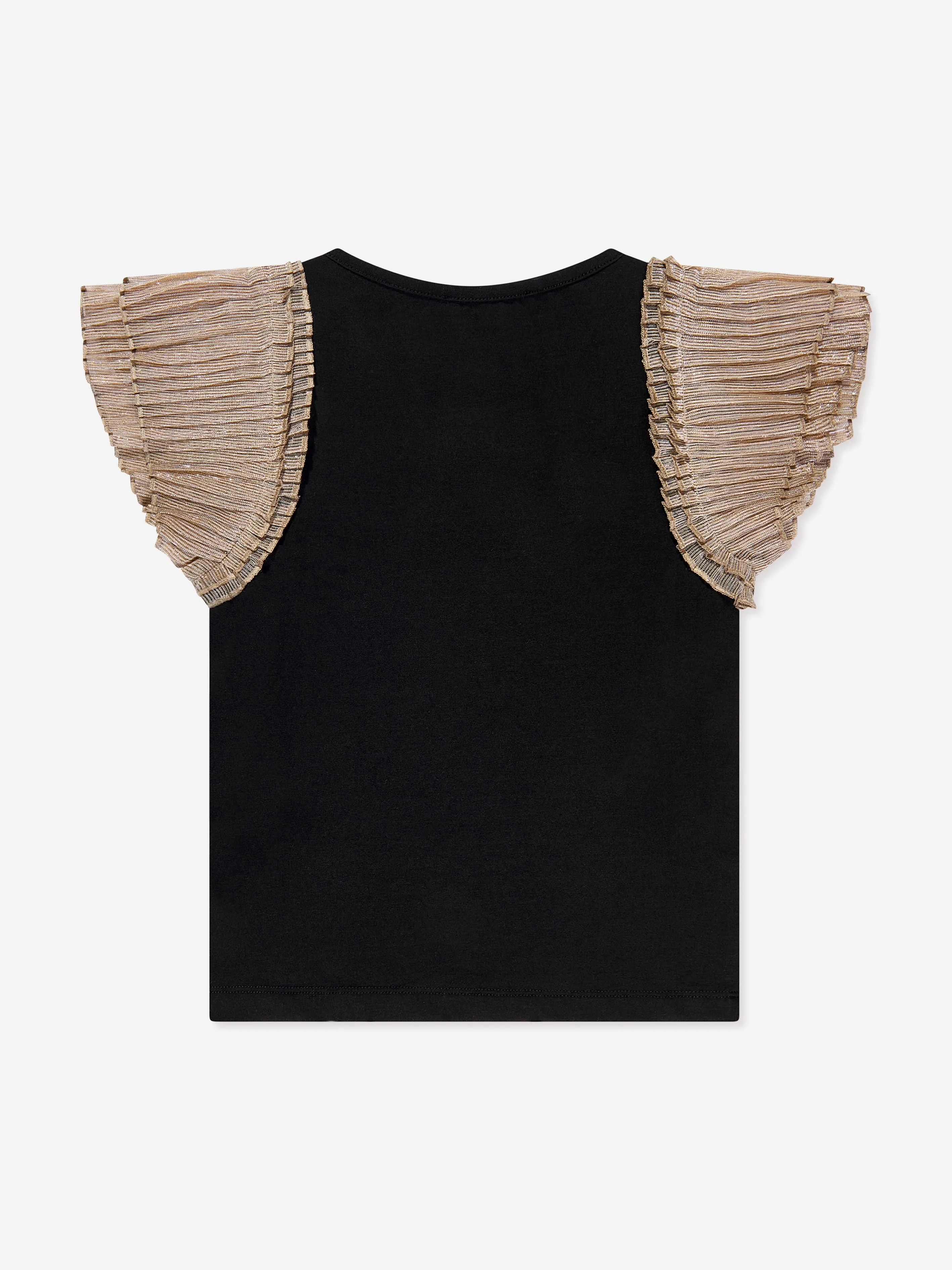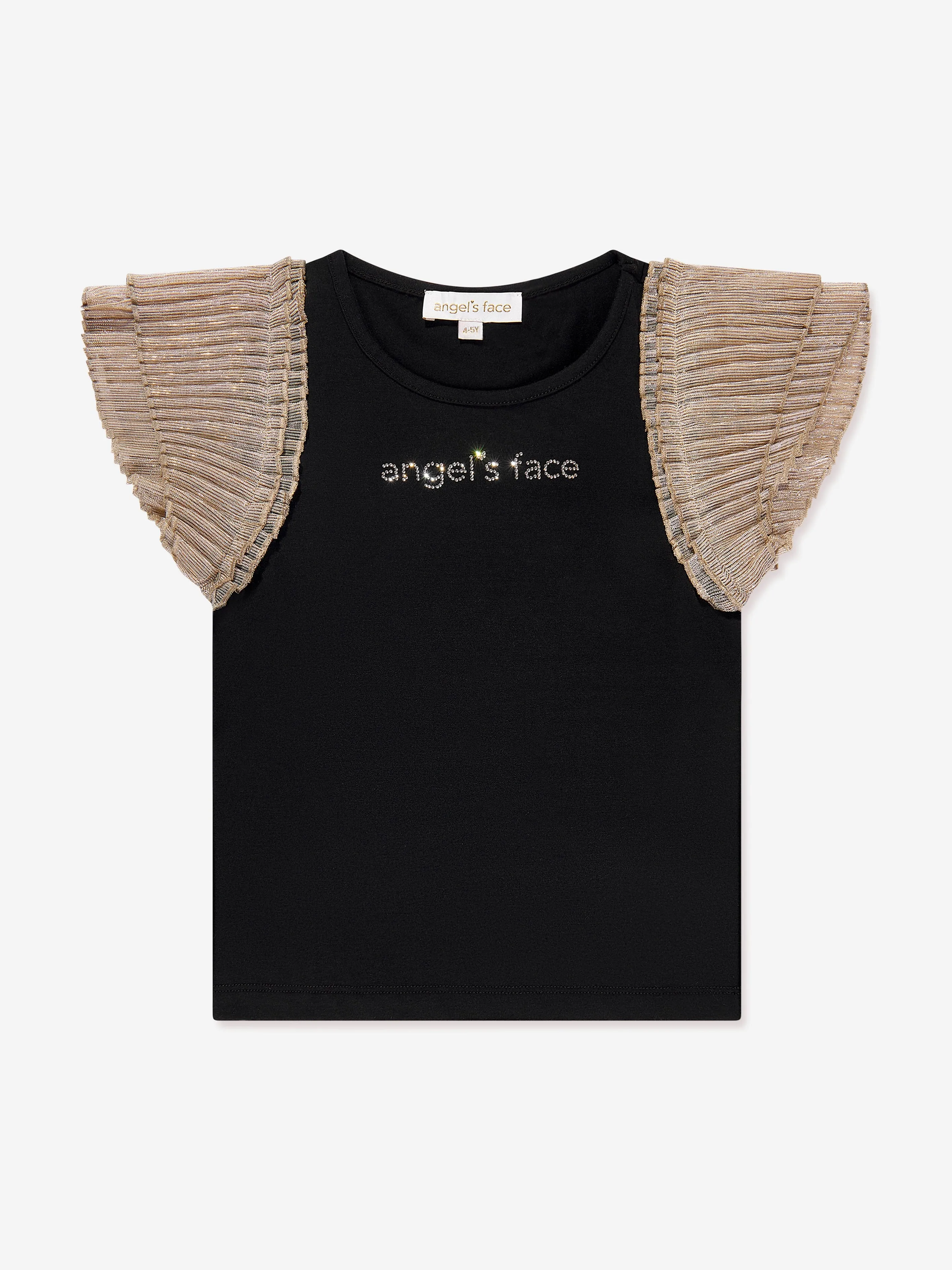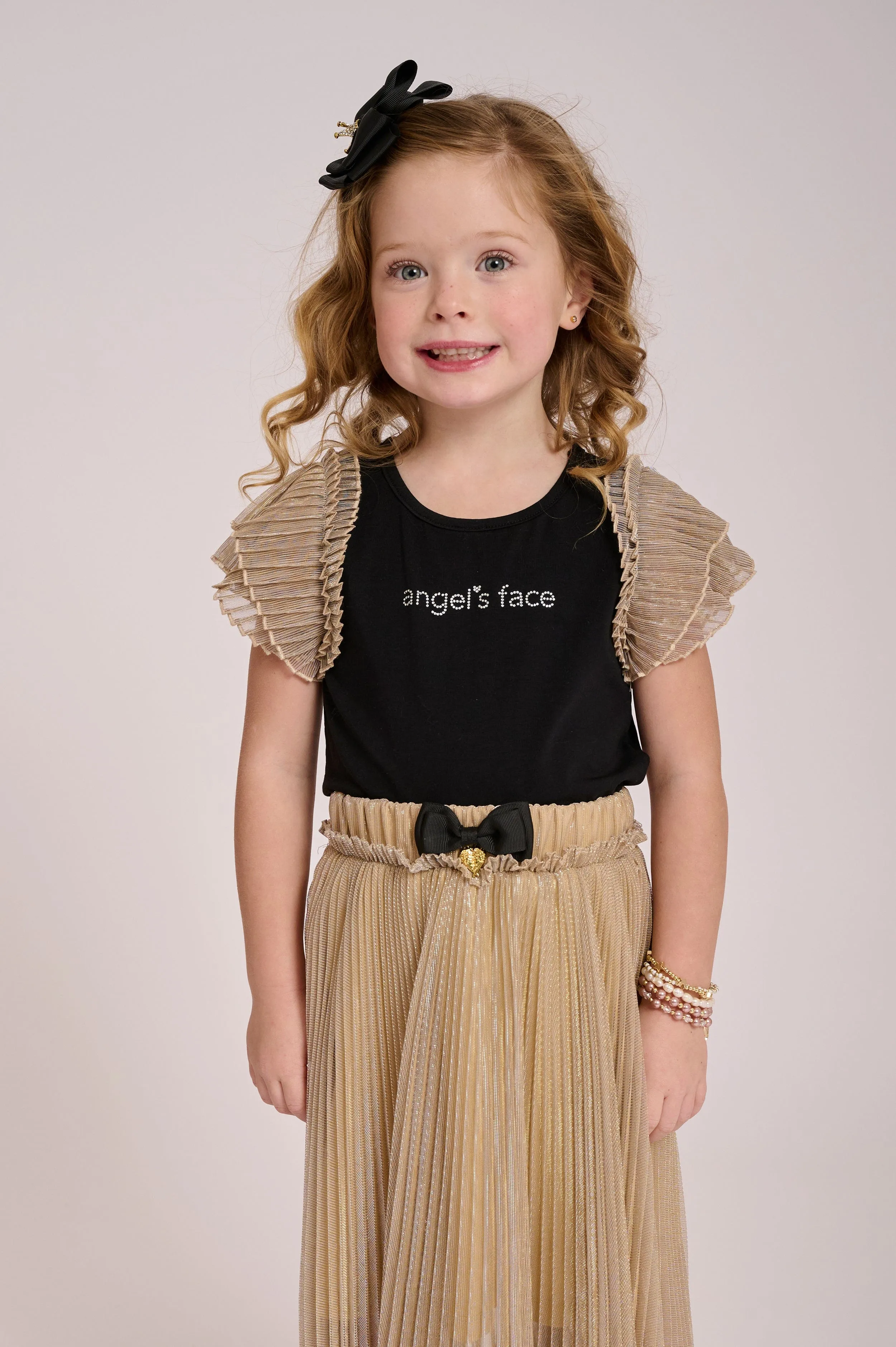 Angel's Face incorporate beautiful proportions into their refined aesthetics. This girls Piper pleated sleeve top in black combines orthodox ideas with an innovative twist. Made in black cotton jersey with contrast gold pleated short sleeves. It features a crystal logo detail and gorgeous shimmering pleated sleeves.