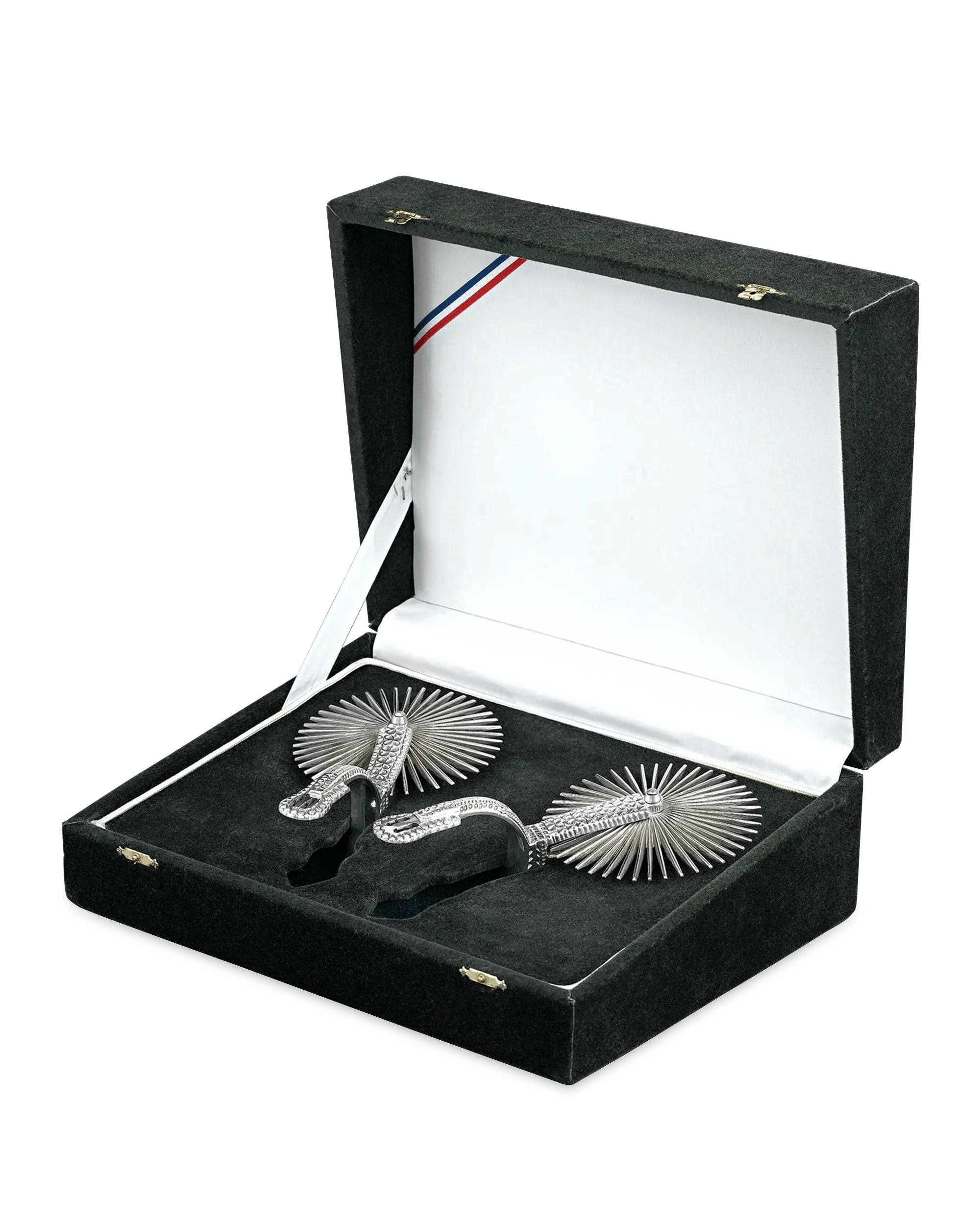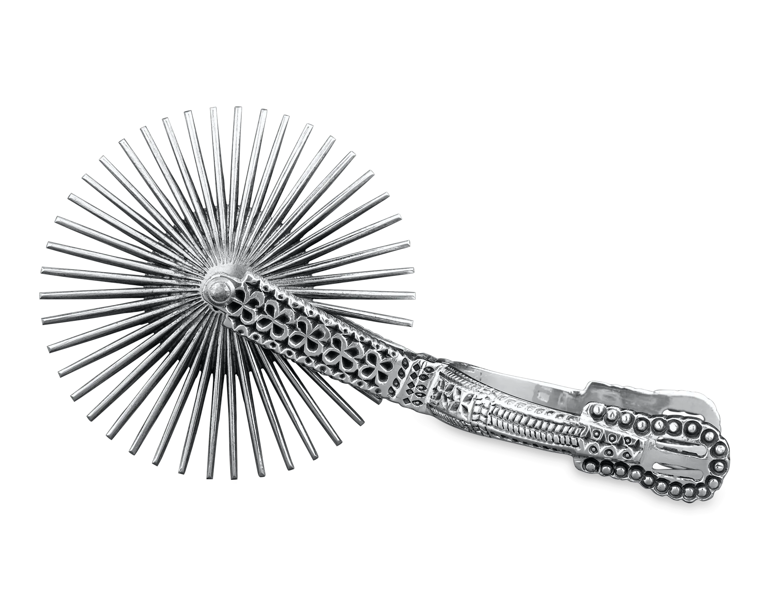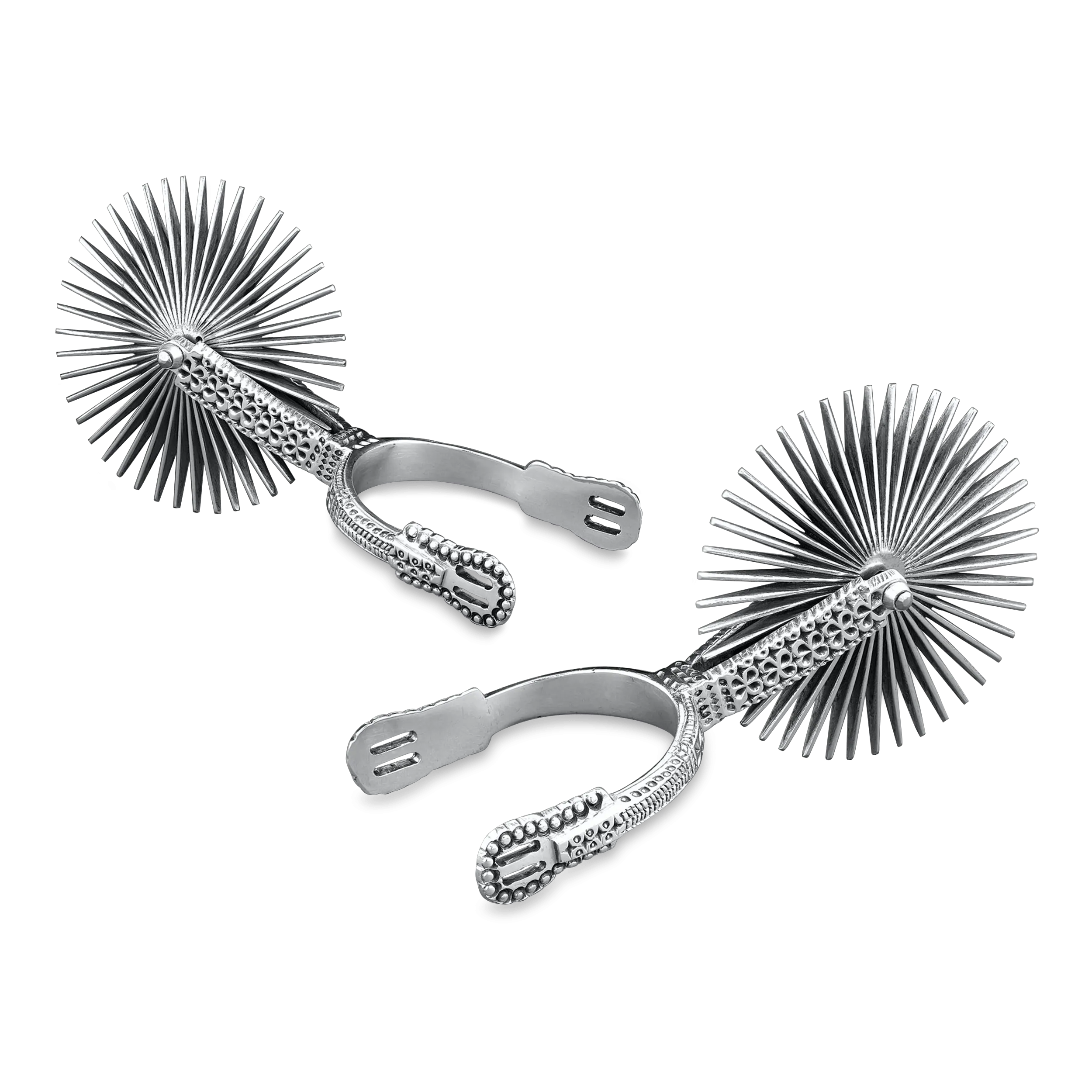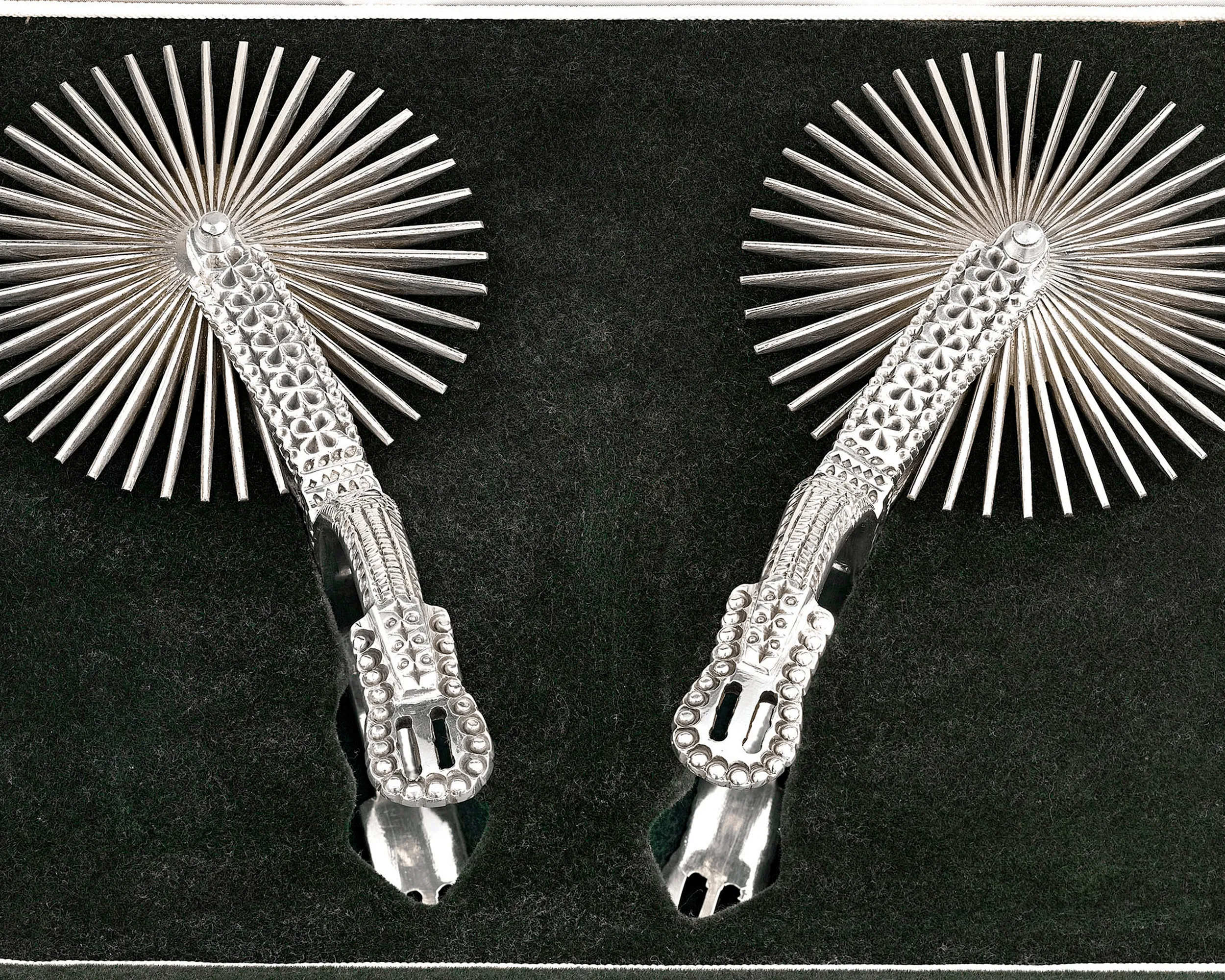 This rare and authentic pair of Chilean spurs is stunning to behold. Traditionally worn by huasos, or Chilean cowboys, these silvered steel spurs, or espuelas, were given by Chile's ambassador to the French ambassador in the late 19th century. Exhibiting exceptional decoration, these spurs are distinguished by the number of spokes they possess, and by the wonderful “singing” sound they produce when spun. Housed in their original presentation case, these intriguing pieces are extraordinary examples of South American artistry.